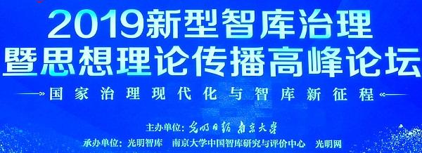 (通讯员 谢陈 赵吟雪)2019年12月19日,由光明日报、南京大学主办,光明智库、南京大学中国智库研究与评价中心、光明网联合承办的“2019新型智库治理暨思想理论传播高峰论坛”在北京举行,论坛主题为“国家治理现代化与智库新征程”。中南财经政法大学法治发展与司法改革研究中心暨湖北法治发展战略研究院院长助理方金海,综合管理部副部长谢陈,科研助理赵吟雪参加了此次论坛。