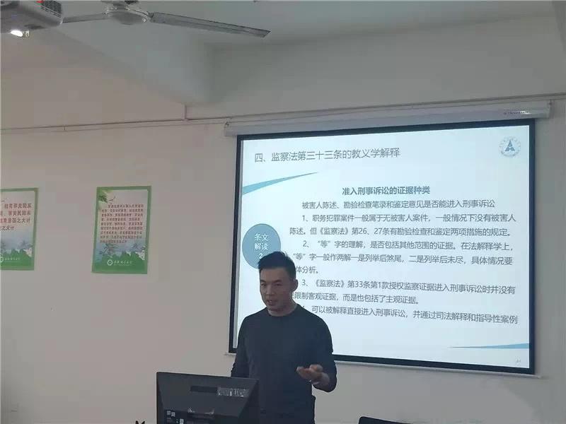 29日上午,陈实副教授做了题为《<监察法>第33条的教义学解释》的学术讲座。陈实副教授分别从监察调查与刑事诉讼的程序二元、监察调查与刑事诉讼的证据一体、法法证据衔接的解释学基本立场、《监察法》第33条的教义学解释四个方面,多角度、分层次、全方位地深入剖析了监察法第33条的内容,通过对比过往与现在证据准入的适用与证据准入的种类现状,清晰地为听众展现了监察法的进步与存在的问题,为在场听众提供了理解和研究监察法的新思路和新方向。