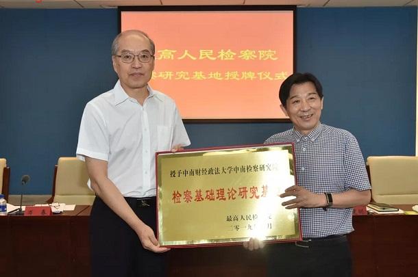(通讯员 陈柏峰)8月30日,最高人民检察院召开检察研究基地授牌仪式暨检察理论工作座谈会,最高人民检察院党组书记、检察长张军、副检察长童建明和检委会专职委员万春等出席。我校“中南检察研究院”被授予最高人民检察院“检察基础理论研究基地”,张军检察长为我校授牌。