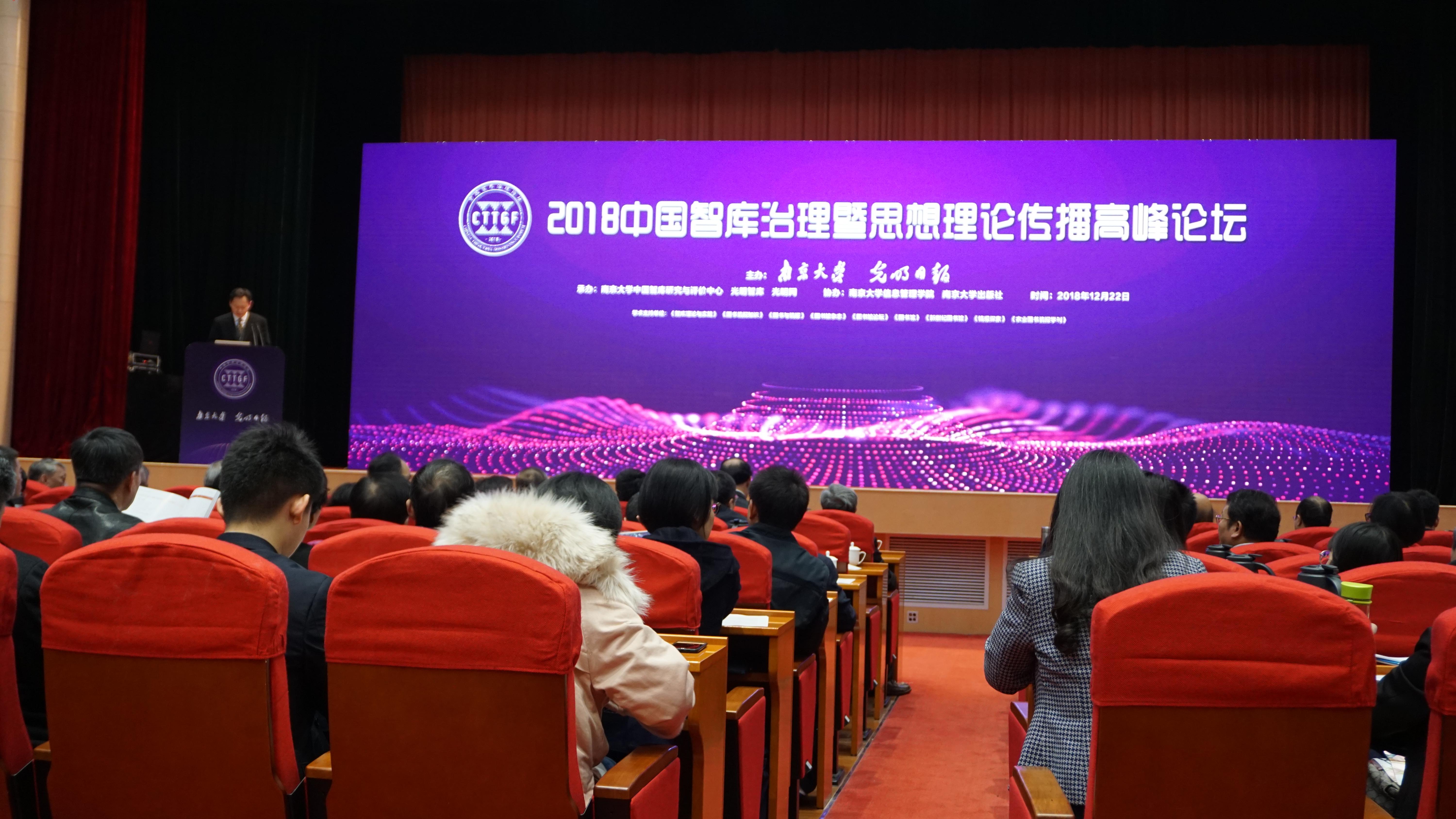 (通讯员 叶 强 郭 倩)12月22日,由南京大学与《光明日报》社联合主办的2018中国智库治理暨思想理论传播高峰论坛在江苏南京举行。来自高校智库、党校(行政学院)智库、政党军智库、社科院智库和民间智库以及管理智库的党政机关和高校社科院的代表500多人参加本次会议。江苏省委宣传部部务委员赵金松,光明日报社副总编辑陆先高,南京大学党委常委、常务副书记杨忠出席开幕式并致辞。