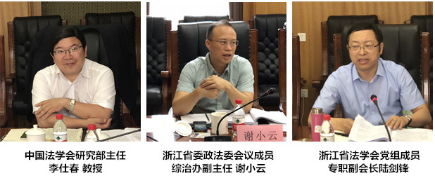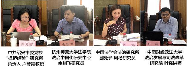 浙江省委政法委会议成员、综治办副主任谢小云,浙江省法学会党组成员、专职副会长陆剑锋,西北政法大学校长助理、最高人民法院司改办副主任汪世荣教授,浙江大学光华法学院钱弘道教授,《浙江警察学院学报》副主编蒋国长教授,中共绍兴市委党校“枫桥经验”研究所负责人卢芳霞教授,杭州师范大学法学院法治中国化研究中心余钊飞研究员,中国法学会法治研究所副处长周杨研究员,中南财经政法大学法治发展与司法改革研究院叶强讲师分别代表各起草小组报告了研究的主要内容,分析了存在的难点和不足。