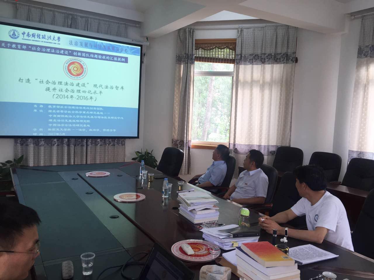校党委书记栾永玉、校长杨灿明在听取了中心-研究院负责人徐汉明教授关于关于“社会治理法治建设创新团队”五年工作情况后,对中心近年来的工作及取得的成绩表示极大地肯定。校党委书记栾永玉说道:徐汉明教授为学校发展做出了很大贡献,他充分调动社会资源及学术资源,依托学校“经管法”优势,跳出学术壁垒,实现学科之间的交叉融合。同时,要把中心-研究院当做学校的“特区”进行支持与发展,让资源、人才交叉流动,打造学校特色。校长杨灿明随后补充讲到:感谢徐教授近年来为学校发展做出的努力,可以说徐教授从学校拿的不到六分之一,贡献却是六倍,他的甘于奉献、踏实工作精神值得我校广大师生学习。