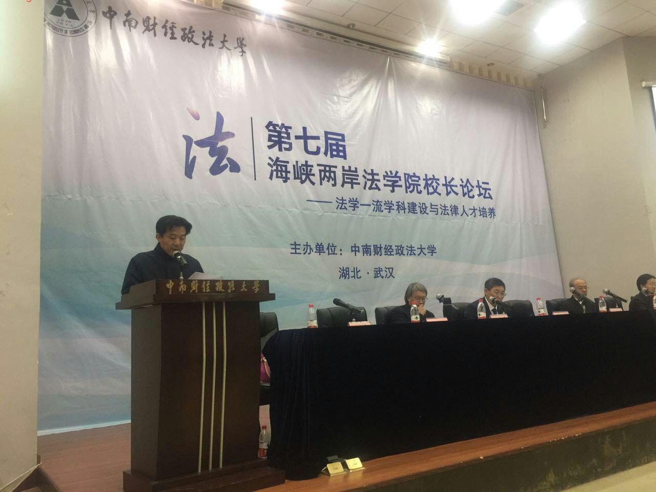 (通讯员,徐凯)2016年10月29日,第七届海峡两岸法学院校长论坛在中南财经政法大学举行。中国政法大学、清华大学、西南政法大学、西北政法大学及东吴大学、澳门大学等海峡两岸暨香港、澳门近40所法学院校的校长、院长、专家学者100余人与会。中南财经政法大学法治发展与司法改革研究中心主任徐汉明参加论坛,并作了题为《深化法学教育改革,助推法治体系和法治能力现代化》的主旨发言。