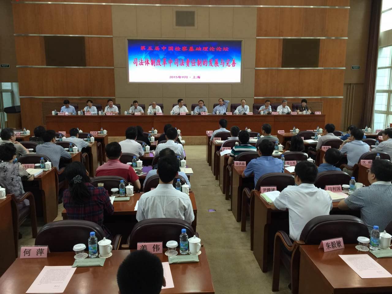 (本网讯 通讯员 曾海涛)9月19日至20日,-第五届中国检察基础理论论坛-在上海举办,来自检察机关、高校法学界的近百名代表以-司法体制改革中司法责任制的健全与完善-为主题,围绕司法责任制的基础理论、具体运行和实现保障三个专题进行了集中研讨。中国检察学研究会检察基础理论专业委员会主任、湖北省检察院检察长敬大力在论坛开幕式上致辞;中国政法大学终身教授陈光中作主题报告。