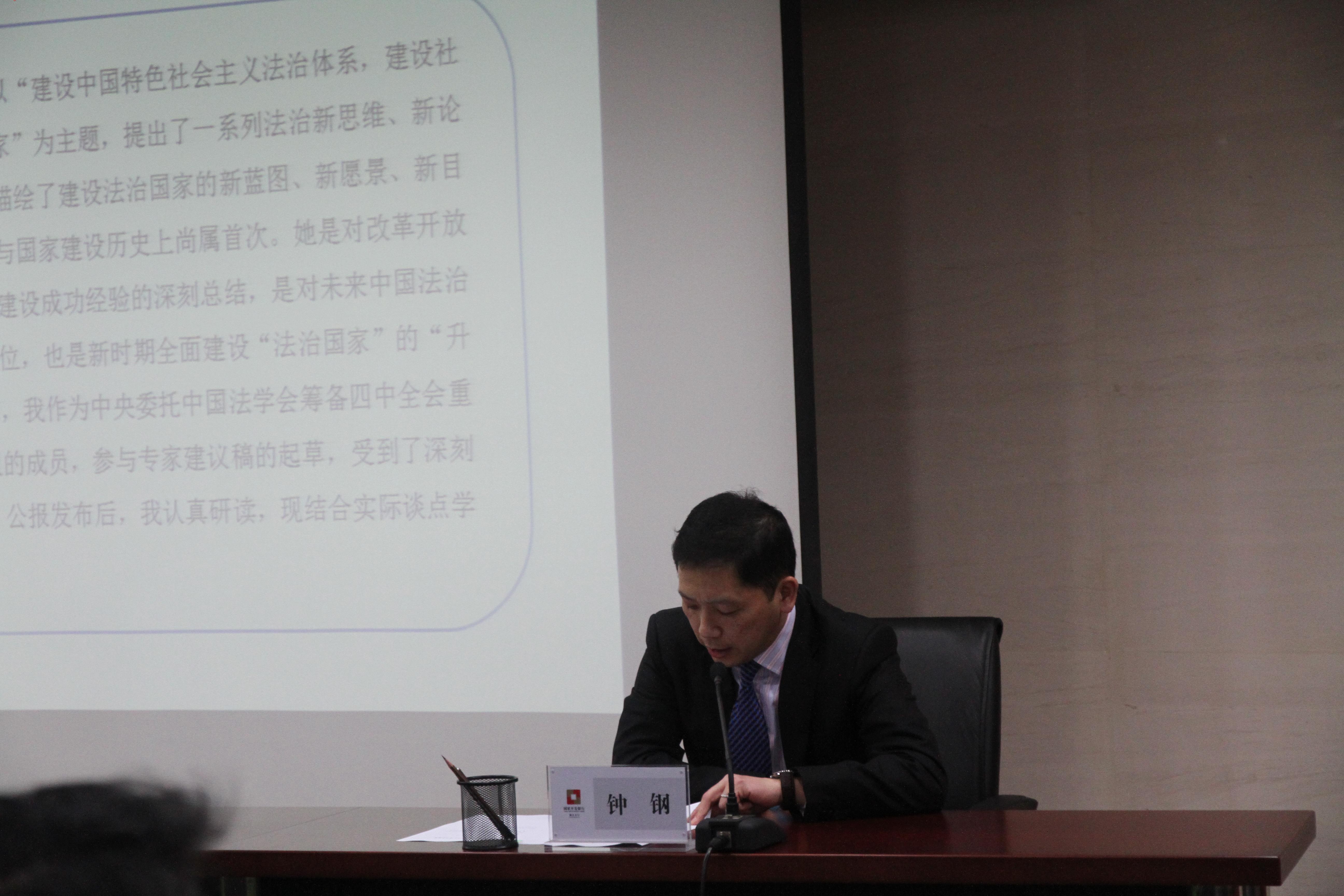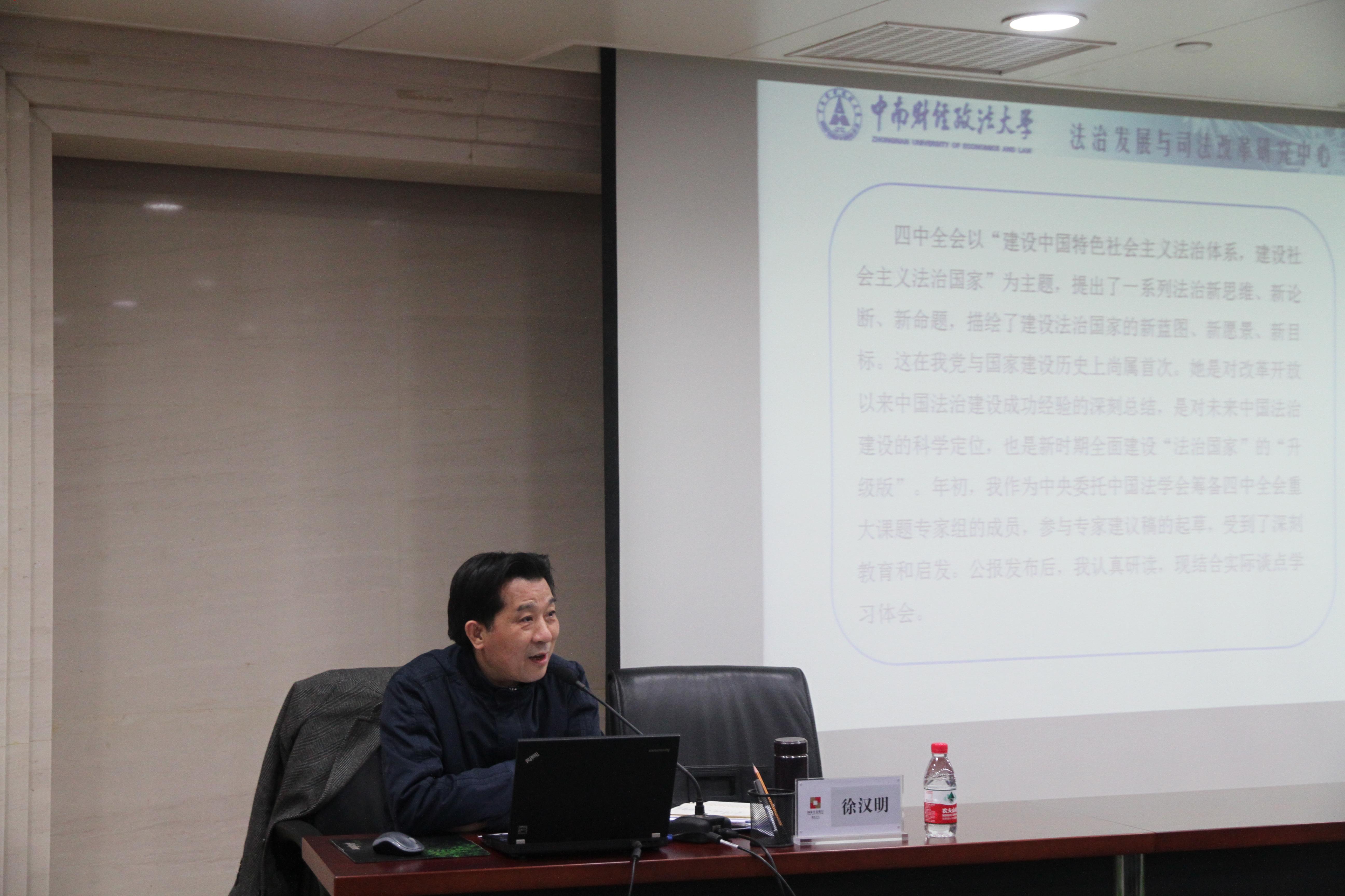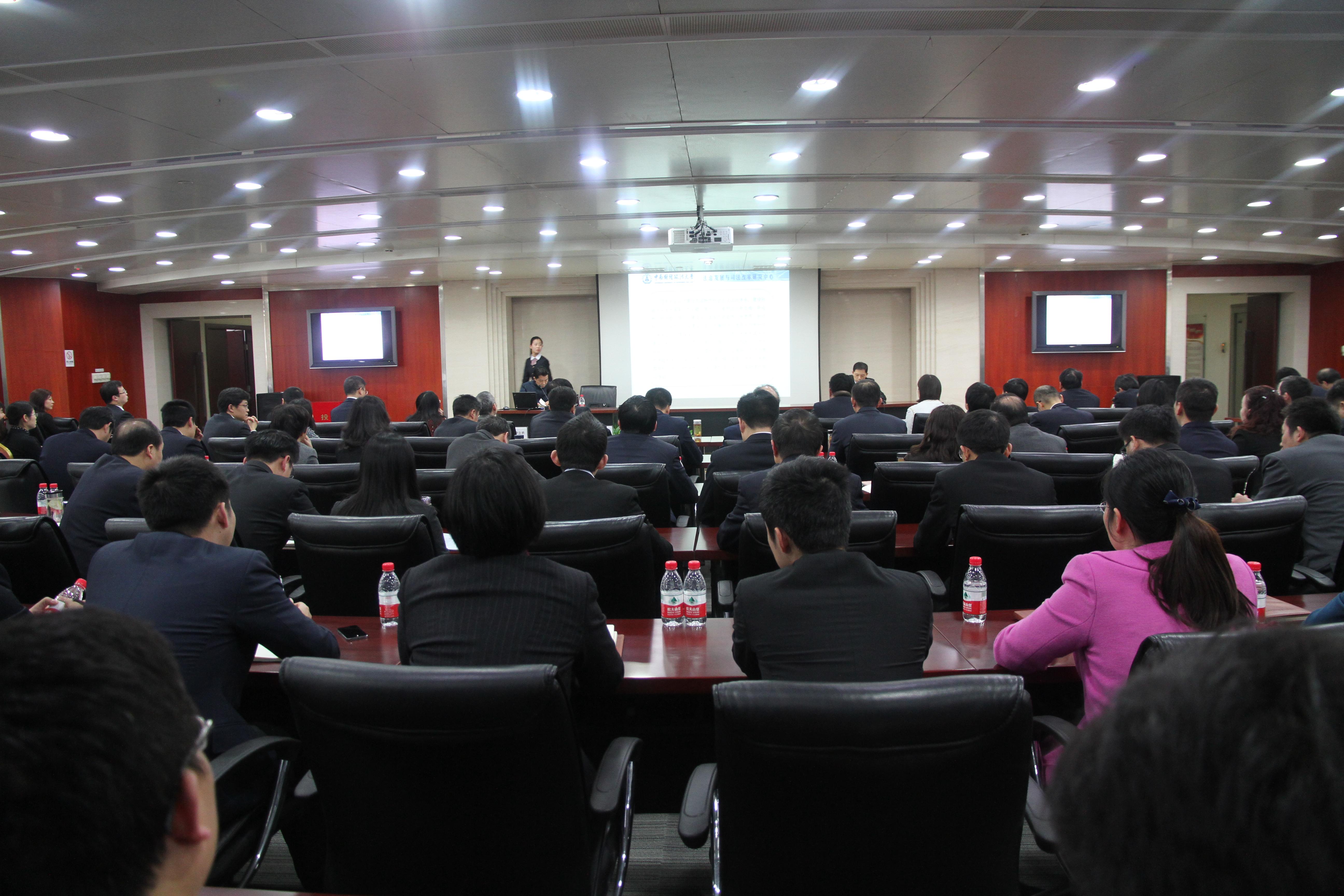 (本网讯 通讯员 曾海涛)中南财经政法大学法治发展与司法改革研究中心主任、湖北法治发展战略研究院院长徐汉明教授在春节期间受国家开发银行湖北省分行邀请,前往该行作了题为《强化法治思维、提升领导干部法治能力》的讲演。本次学术报告会由国家开发银行湖北省分行党委书记钟钢主持。