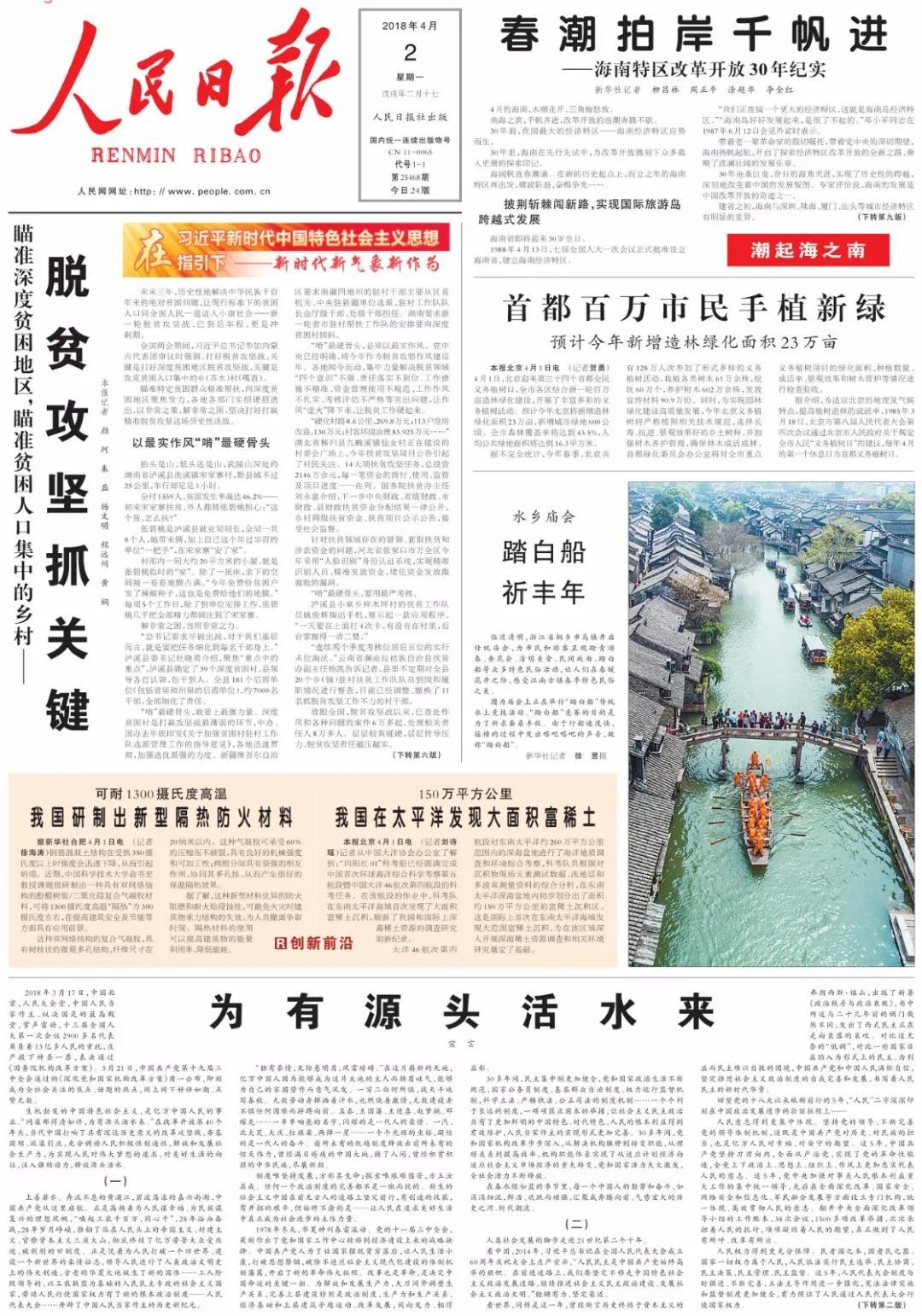 来源:《人民日报》(2018年4月2日 第1版),作者:宣 言