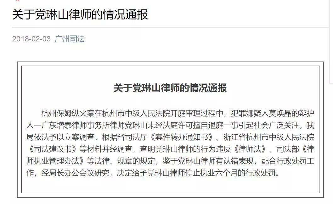 杭州保姆纵火案在杭州市中级人民法院开庭审理过程中,犯罪嫌疑人莫焕晶的辩护人-广东增泰律师事务所律师党琳山未经法庭许可擅自退庭一事引起社会广泛关注。