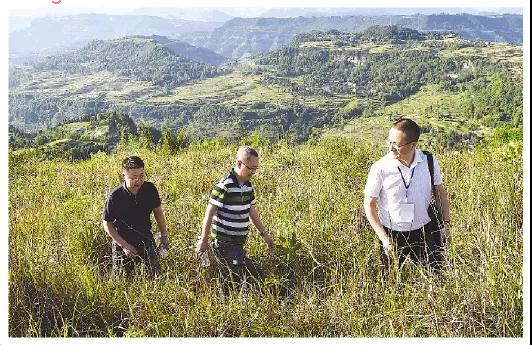 2017年5月17日,四川省达州市千宁村法律顾问唐隆茂(右一)与村干部爬山路进村入户。记者 王建军 杨晋峰 通讯员 苏媛媛 摄