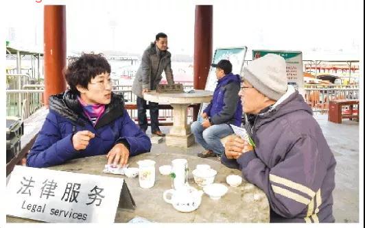 2017年12月31日,公益律师孟宪红(左)在北京市丰台区司法局设立的-普法茶亭-为群众义务提供法律咨询服务。记者 王建军 杨晋峰 通讯员 苏媛媛 摄