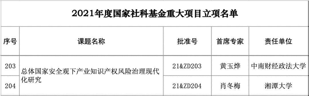 12月6日,全国哲学社会科学工作办公室公布“2021年度国家社科基金重大项目立项名单”,中心黄玉烨教授作为首席专家申报的“总体国家安全观下产业知识产权风险治理现代化研究”获批立项。这是中心专家团队成功申报立项的第四个国家社科基金重大项目。